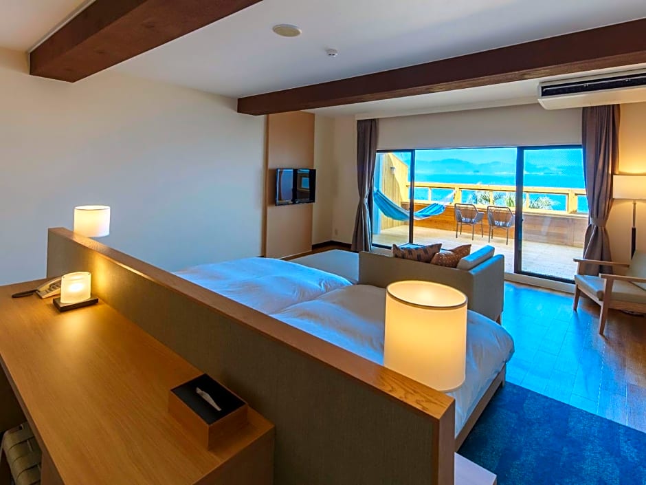 Guest amenities include free private parking, free Wi-Fi, and a free shuttle service, with notable features such as a restaurant, terrace, garden, and balcony. Inside, amenities include a 24-hour front desk, air conditioning, kitchenette, bathtub, free toiletries, and a hot spring bath (free). For leisure, snorkeling (extra charges), a private beach area (extra charges), spa (extra charges), sauna (extra charges), massage (extra charges), and meeting/banquet facilities (extra charges) are available, along with kids' club and kids' meals (extra charges).