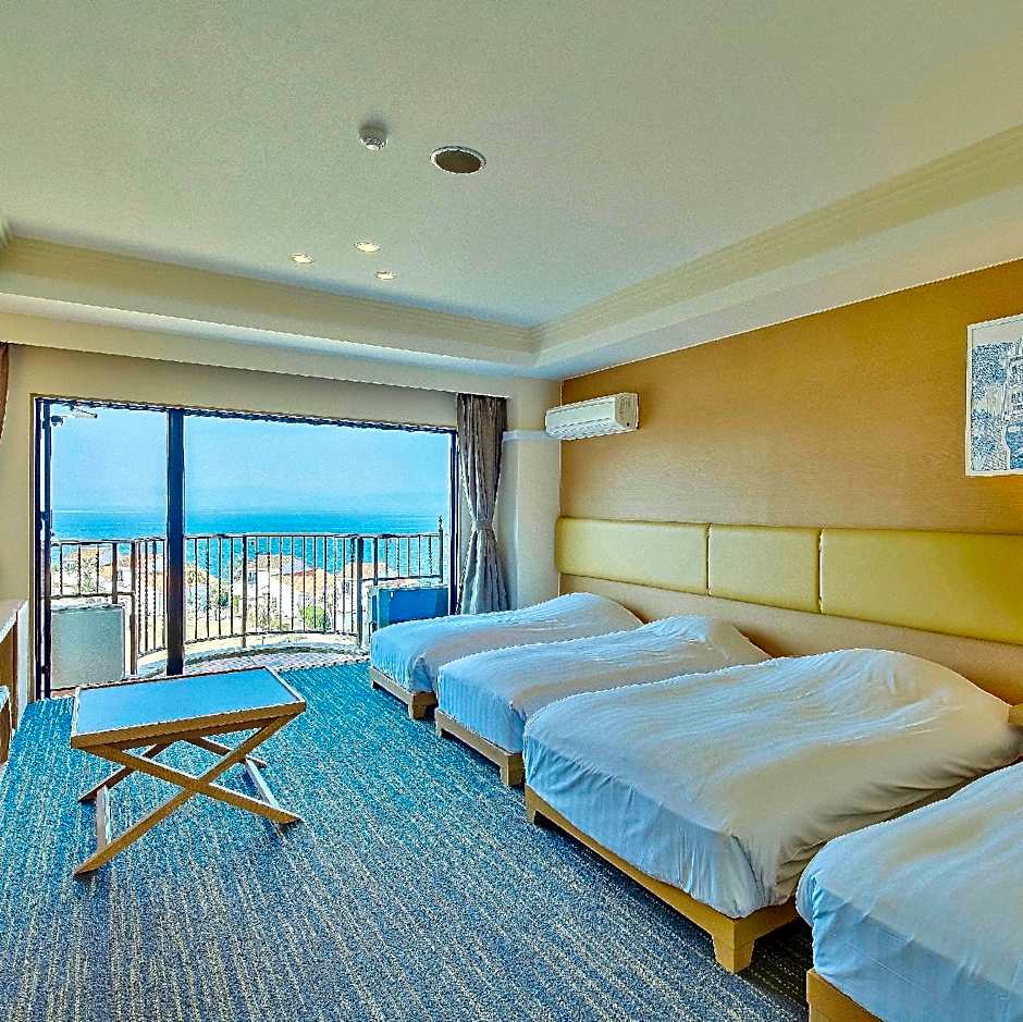 The hotel offers a variety of rooms including Hollywood Twin, Twin Room with Ocean View, Terrace Lodge Twin, Terrace Lodge Family, Standard Twin, Family Lodge Twin, and Standard Quadruple rooms. All rooms have a no-smoking policy and can accommodate either 2 adults and 1 child or 4 adults and 2 children, with bed options ranging from 2 twin beds to 2 twin beds and 2 sofa beds. Room sizes range from 258 sqft to 581 sqft.