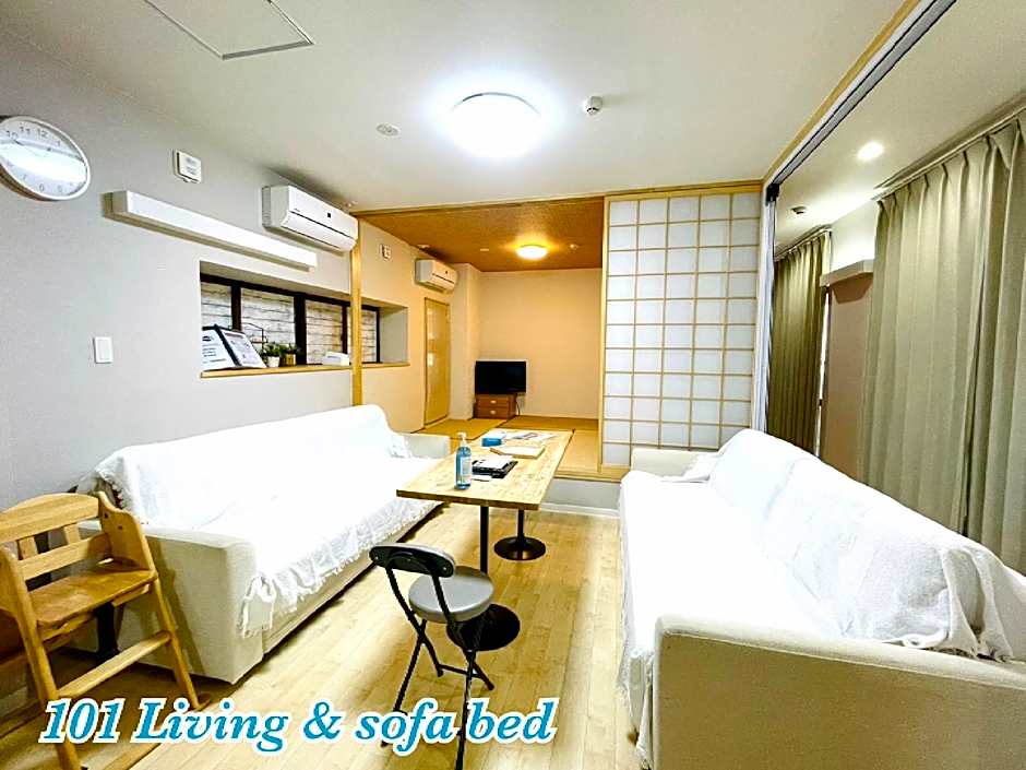 Providing free toiletries, this family room includes a private bathroom with a shower, a hairdryer and slippers. The spacious air-conditioned family room provides a flat-screen TV, a washing machine, tatami, an electric kettle as well as a quiet street view. The unit offers 4 beds and 3 futons.