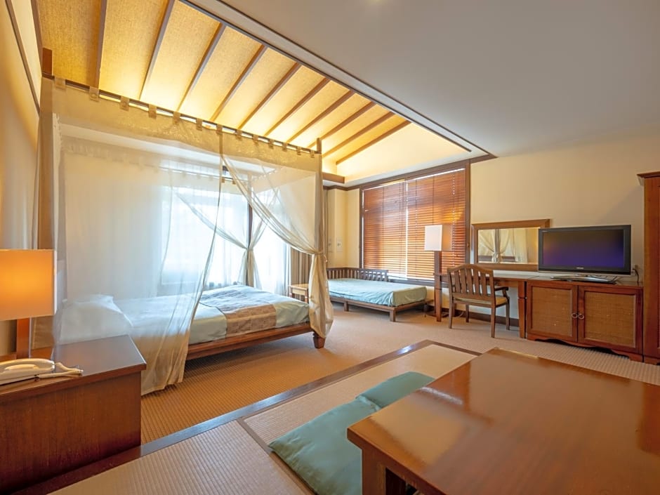 The spacious family room offers air conditioning, tatami, as well as a private bathroom boasting a bath and a hairdryer. The family room has carpeted floors, a seating area with a flat-screen TV, a wardrobe, a safe deposit box, as well as an electric kettle. The unit has 2 beds and 3 futons.