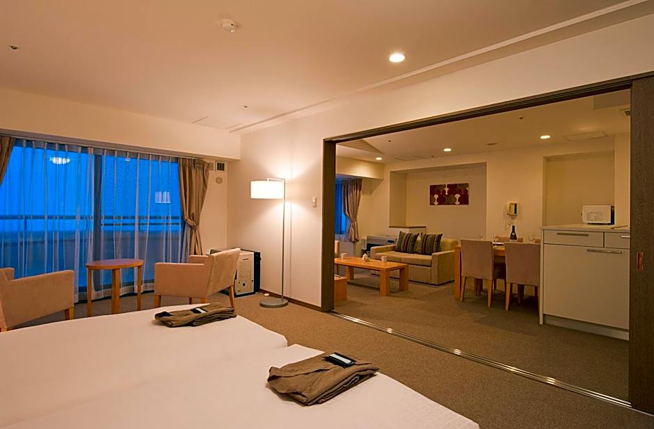 Spacious room in neutral colors, featuring mountain views and a balcony. It comes with a comfortable living area, a dining area and a kitchenette. Amenities include a flat-screen TV and a tea maker. It comes with 2 single beds, 1 sofa bed and 2 traditional futon mattresses.