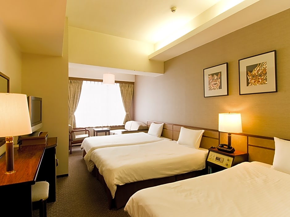 This spacious room features carpeted floors, a fridge and an electric kettle with green tea bags. The private bathroom comes with a bathtub and a hairdryer. Each room offers views of Naha city.