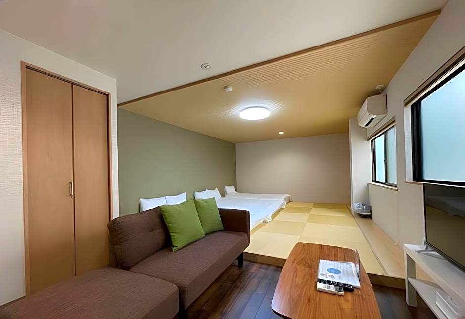 This family room's special feature is the hot tub. The family room provides air conditioning, a washing machine, as well as a private bathroom featuring a bath and a shower. Guests can make meals in the kitchen that is equipped with a stovetop, a refrigerator, kitchenware and a microwave. The family room offers tatami, a dining area, a wardrobe, an electric kettle and a flat-screen TV. The unit offers 3 beds.