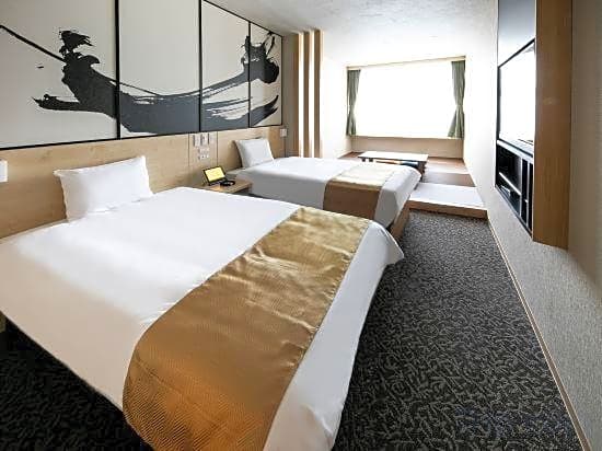 At Sakishima Cosmo Tower Hotel, guests can choose between Hollywood Twin Rooms, Twin Rooms with Tatami Area, and Twin Rooms with Sofa. All rooms are non-smoking and twin type, accommodating up to 4 adults and 1 child. Bed options include double beds, twin beds, futon mats, and sofa beds. Room sizes range from 377 to 420 sqft.