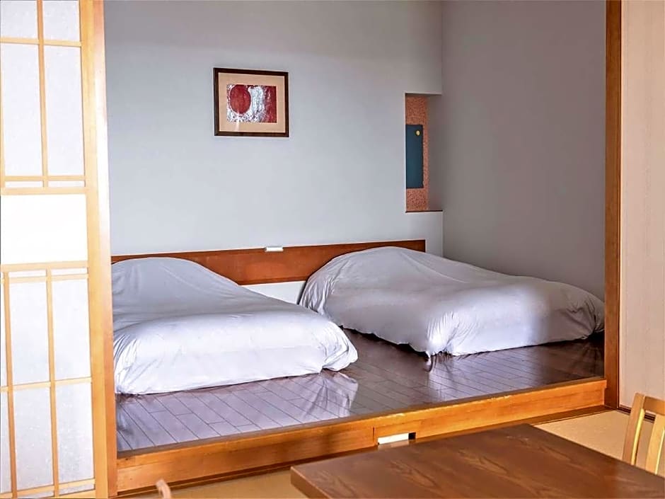 This twin room features a private open-air bath. The spacious twin room offers air conditioning, tatami, as well as a private bathroom boasting a shower and a bidet. The twin room provides a safe deposit box, an electric kettle, pajamas, yukata, as well as a flat-screen TV. The unit has 2 beds and 3 futons.
