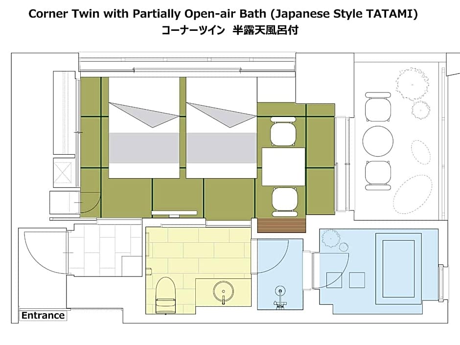 This twin room features a private open-air bath. The spacious twin room features air conditioning, tatami, a terrace with river views as well as a private bathroom boasting a bath. The unit has 2 beds.