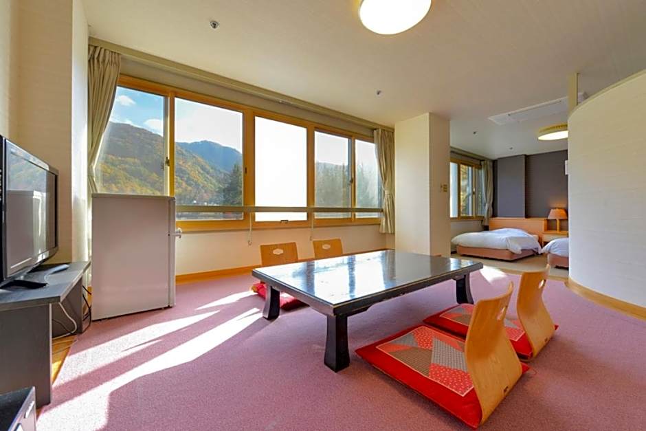 Room options come in several styles, including Standard, Standard Japanese Style, Standard Japanese Western, Economy Japanese Style, and Annex Building accommodations. For families and groups, layouts like Standard Japanese Style, Single Use, Shared Bathroom accommodate up to 5 adults and 4 children, while Standard Japanese Style, Single Use fits up to 3 adults and 2 children. A Mountain View option named Room - 2 Bed offers a two-person setup with twin beds, and most rooms are non-smoking, with at least one smoking-allowed option available.