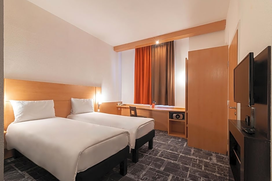 Premium room from ibis with twin beds and the c ity view.
