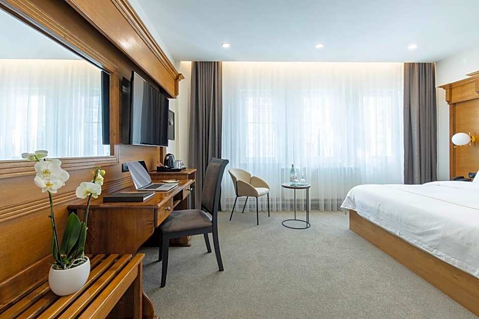 Luxurious room equipped with air conditioning, LCD cable TV, mini bar and safety box. The elegant bathroom is equipped with a hydromassage shower bath, hair dryer, slippers and free toiletries.