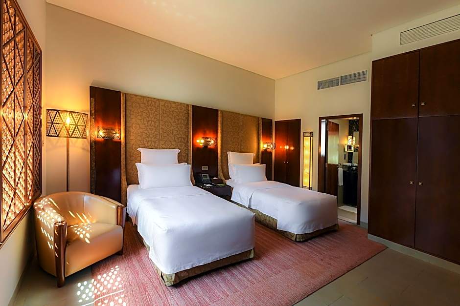 The Jumeirah Messilah Beach Hotel & Spa Kuwait offers a range of rooms including two-bedroom apartments, royal suites, five-bedroom villas, two-bedroom duplexes, deluxe twin rooms, three-bedroom villas, deluxe double rooms, grand deluxe rooms, deluxe suites, one-bedroom apartments, and three-bedroom apartments. Smoking is not allowed in any of these rooms. The rooms accommodate different numbers of adults and children, with bed sizes varying from twin beds to king and queen size beds.