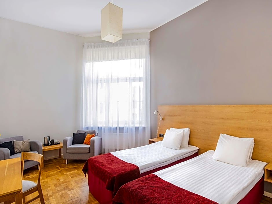 The Hotel Valdemars Riga managed by Accor offers a variety of room types including Comfort Twin, Comfort Single, Standard Double, Comfort Double, Standard Twin, Executive with One Double Bed and Sofa, and Comfort Suite. None of the rooms allow smoking. The rooms range in size from 129 sqft to 377 sqft. The occupancy capacity varies from 1 adult in the Comfort Single Room to 3 adults and 2 children in the Executive Room with One Double Bed and Sofa.