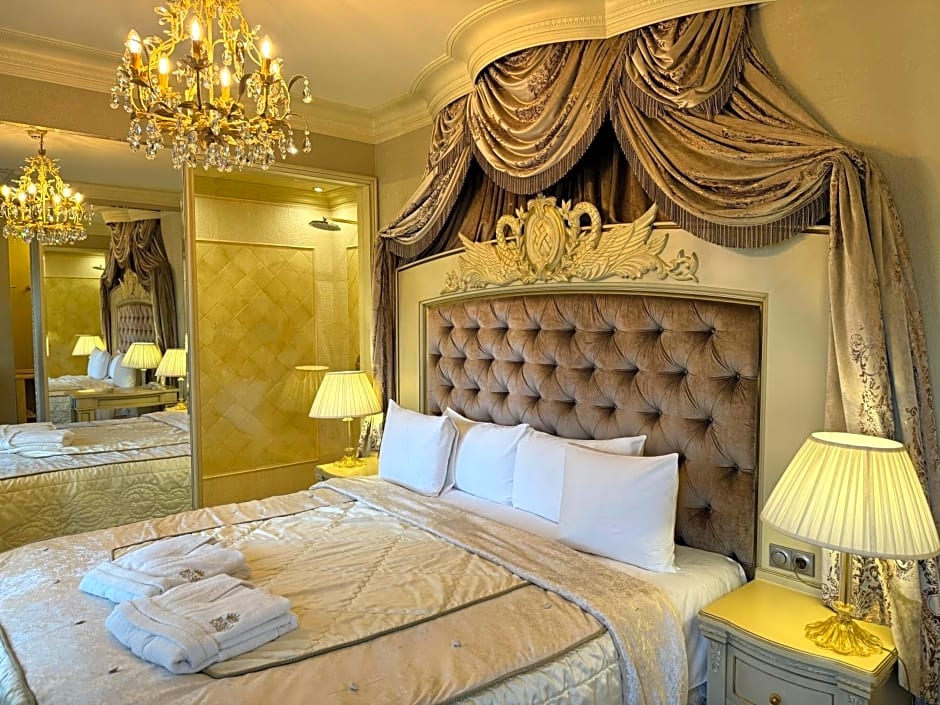The Royal Casino SPA & Hotel Resort offers a variety of rooms, including Premium Twin Suites, Luxury Double Rooms, Golf Deluxe Rooms, Barcelona Deluxe Rooms, Le Chalet Junior Suites, Suites, Premium Double Suites, London Deluxe Rooms, Dubai Junior Suites, and Versace Suites. Occupancy ranges from 2 to 4 adults, with some rooms accommodating an additional child. None of the rooms allow smoking. Bed sizes include King size beds, and room sizes vary from 344 sqft to 1851 sqft.