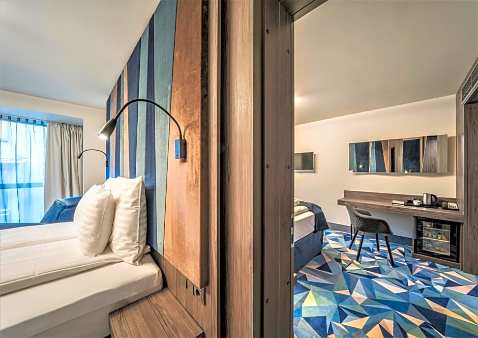 Rooms of this category are suitable for families with children or group of friends, who wish to spend the night together in a shared room. The room has two separate bedrooms and a bathroom with a heated floor. For guests' convenience, the room is equipped with air-conditioner, safe, appliances for ironing and in-room coffee/tea provisions. Free Wi-Fi is available in all public areas and rooms of Wellton Riverside SPA Hotel. Please note that Aqua Thermal Area visit and SPA treatments are for extra charge and must be booked in advance.
