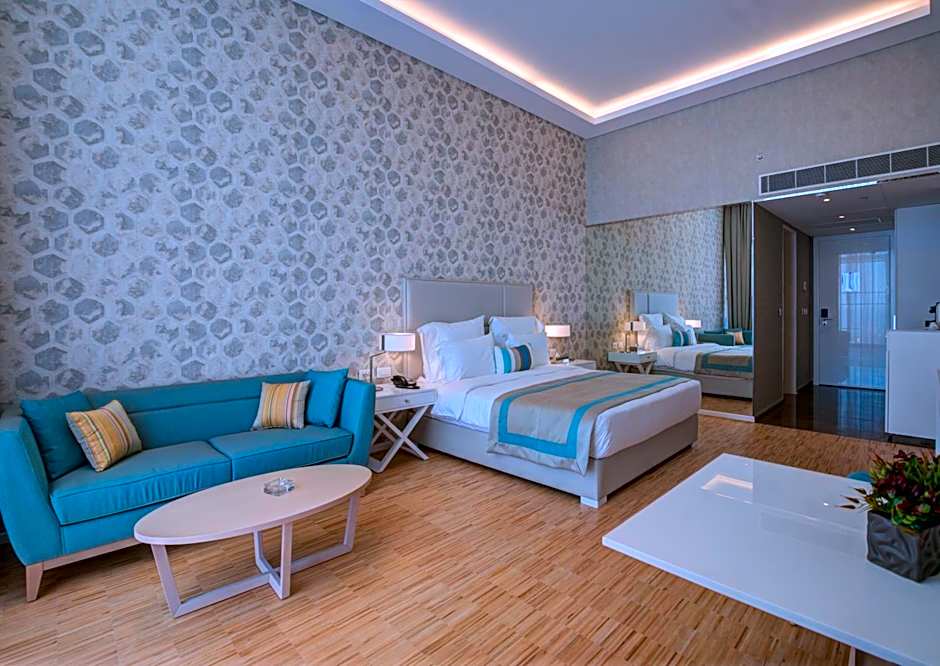 Discover the grandeur of our Superior Bay Room, an expansive 48 square yards of refined luxury. With an exceptional contemporary modern interior, including a 5-yard high ceiling, this room exudes sophistication and spaciousness. Delight in your private terrace or balcony, where sunbeds a wait for your relaxation and sun-soaking pleasure. Choose between a plush king bed or versatile twin beds to suit your needs. The room features two bathrooms, one of which features a private Jacuzzi with an open view to the main bedroom and the sea, enhancing your experience of indulgence and tranquility. Enjoy breathtaking panoramic sea views and unwind in the stylish indoor seating area. Equipped with top-tier 5-star amenities, including a coffee machine, and a modern walk-in shower, this room promises a stay of unparalleled comfort and elegance.