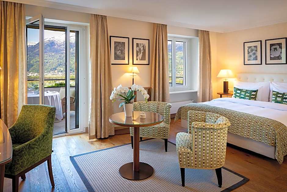 Dining is anchored by Restaurant #1, serving French and Mediterranean cuisines. A diverse range of rooms and suites provides mountain-view panoramas or garden vistas, including Boutique Junior Suites with Queen or King beds and various suites. Pets are allowed (charges may apply), and payment options include cash and major cards such as Mastercard, Visa, Diners Club, American Express, Maestro, and EC-Card.