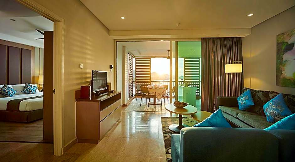 Executive Studio Suite Seaview Room is 1076 square feet and includes a king-size bed 150-183 width plus living room, extra beds on demand, and ironing set.