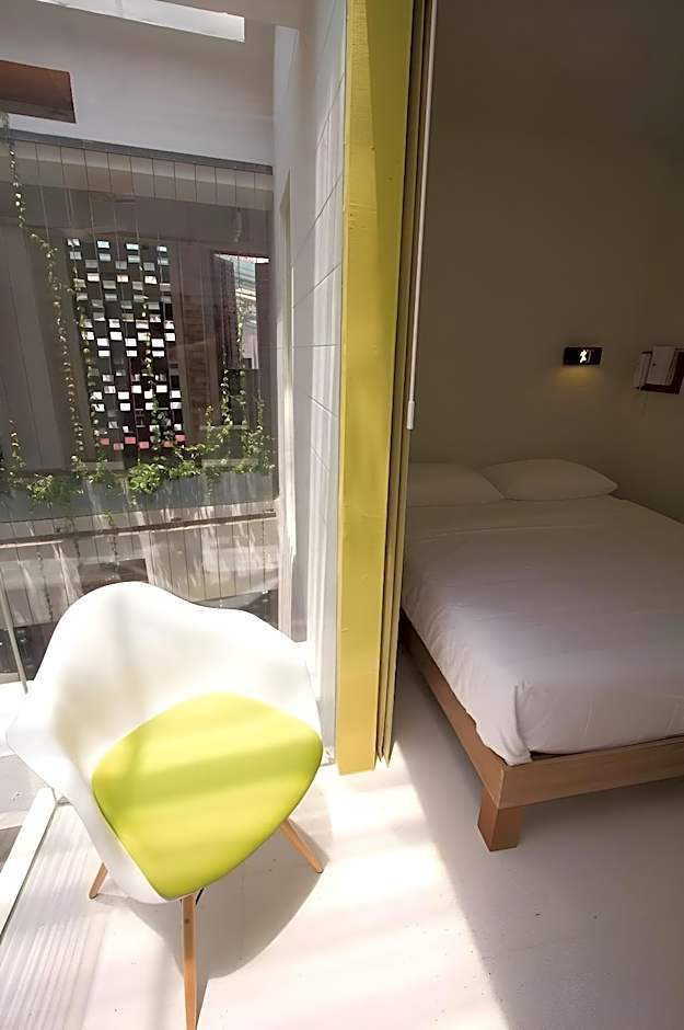 Modern rooms feature air conditioning, a queen-sized bed and a glass-box balcony overlooking the hotel's indoor courtyard. The private bathroom has hot/cold shower facility, towels and free toiletries.
