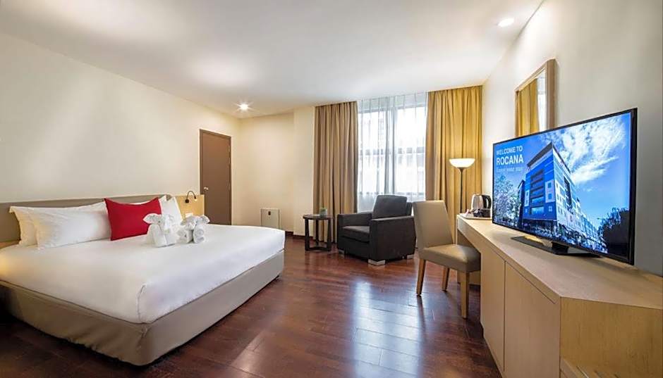 Rocana Hotel offers a variety of room types, including Superior Twin Rooms with twin beds, Deluxe Double Rooms with a king-size bed, and Superior Double Rooms with a queen-size bed. All rooms are non-smoking and accommodate either 1 or 2 adults with the option for 1 child. Room sizes range from 334 sqft to 398 sqft.