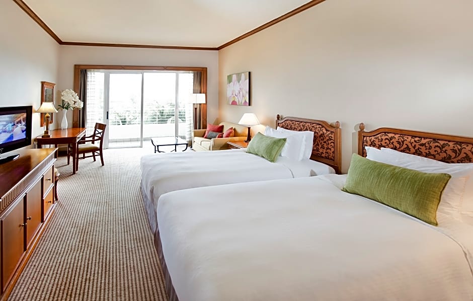 The Dorsett Grand Labuan hotel offers Deluxe Rooms with a city view. These rooms are TwinDouble type and have a size of 388 sqft. Smoking is not allowed in these rooms. Each room can accommodate 2 adults and 2 children, and it has a combination of 1 King size bed and 2 Twin beds.