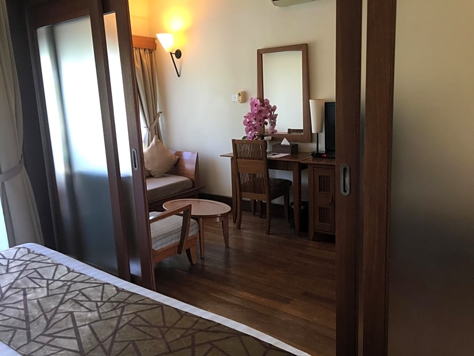 Escape to our spacious Family Room with Garden View, offering a king size bed, cozy sofa bed, and plenty of room for everyone to relax. Enjoy the peaceful garden view, modern amenities, and a private bathroom for a truly comfortable stay.