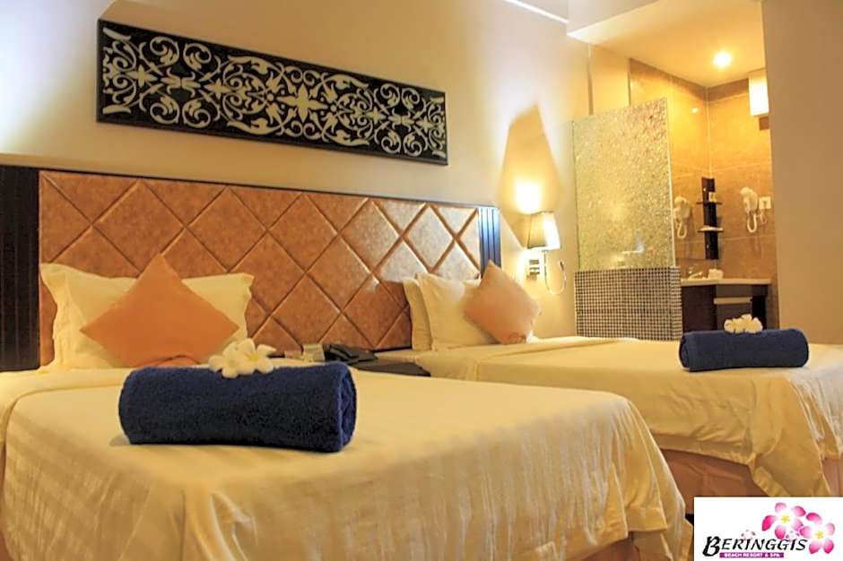 The Beringgis Beach Resort & Spa offers Deluxe Double or Twin Rooms with either a Garden View or Pool View, each accommodating 2 adults and 1 child with bed options of 2 twin beds and 1 king size bed or 2 twin beds and 1 double bed. Smoking is not allowed in these rooms, which are 323 sqft in size. Additionally, the hotel provides a larger option with their Quadruple Duplex Room, which has 2 twin beds and 1 king size bed, accommodating 4 adults and 1 child in a 646 sqft space, also with no smoking allowed.