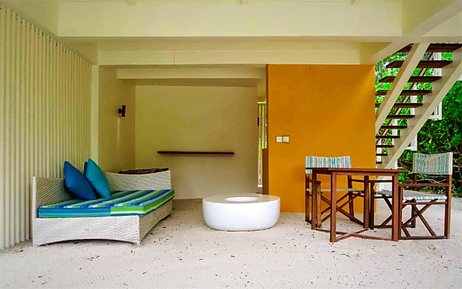 Three Bedroom Beach Villa with Pool at Holiday Inn Kandooma Maldives is a spacious family villa designed with the comfort of every individual in mind. The first floor features a master bedroom and a second bedroom with king or twin beds, each equipped with its own balcony and third bedroom located in the ground level with king or twin beds. The ground floor has an open concept living area and outdoor terrace with plunge pool and direct access to the beach.