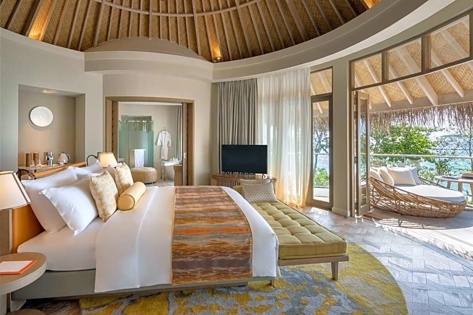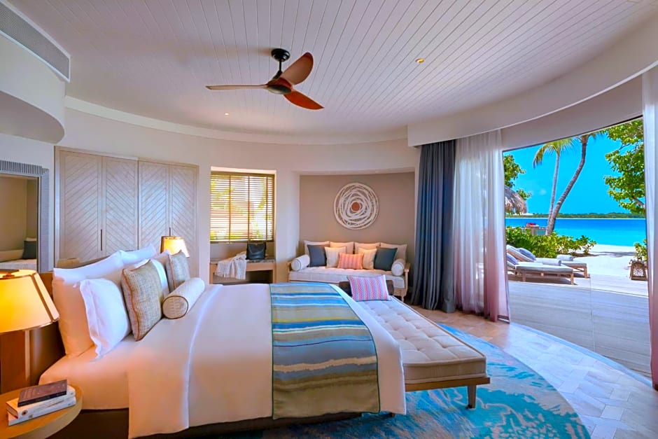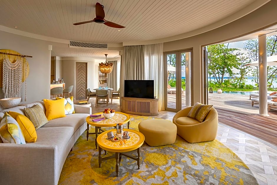 Sprawled on stilts over the lagoon, boasting extraordinary sunset views and a wide, curved poolside sun deck, The Nautilus Retreat invites guests to live the quintessential Maldivian dream. With two bedrooms fanning out from the central living and dining rooms, each complemented by a brilliant sea view and private bathroom, this is a space for fostering family reconnection and long-lingering memories