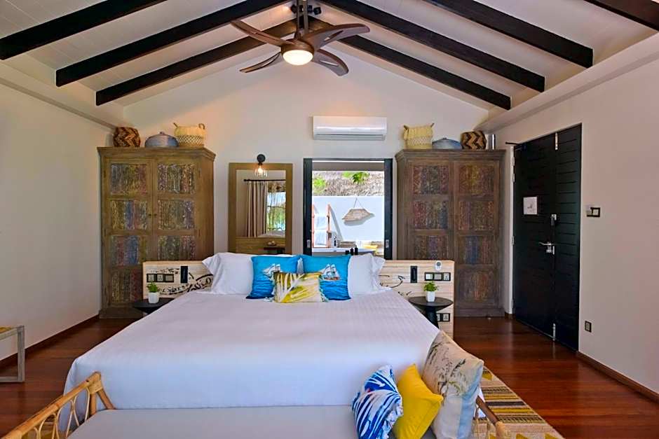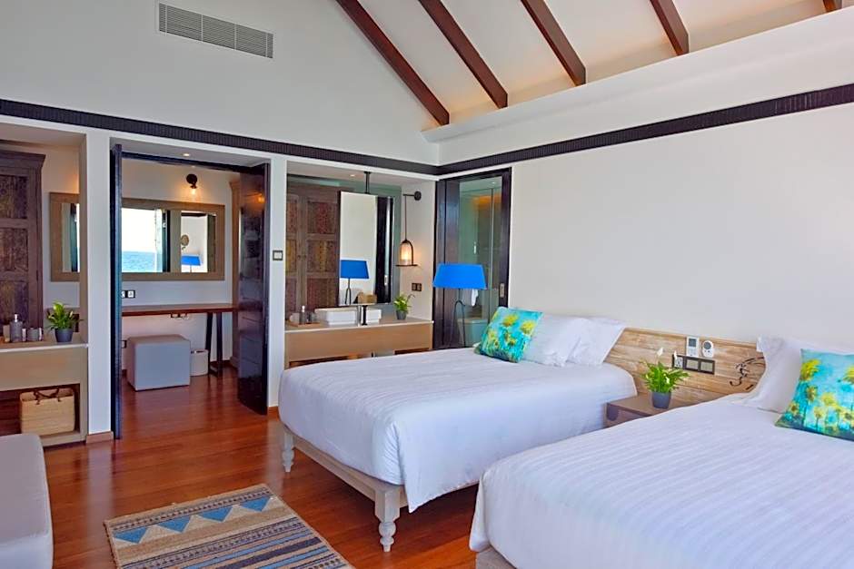 REEF POOL WATER VILLA is 1001 square feet and includes a king-size bed 150-183 width plus extra beds on demand and bathrobes.