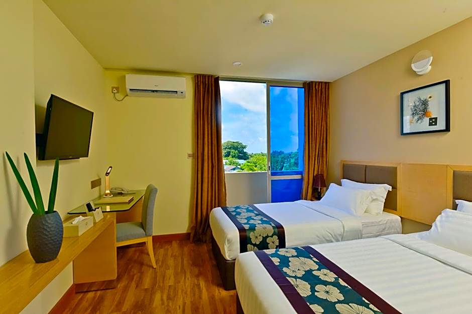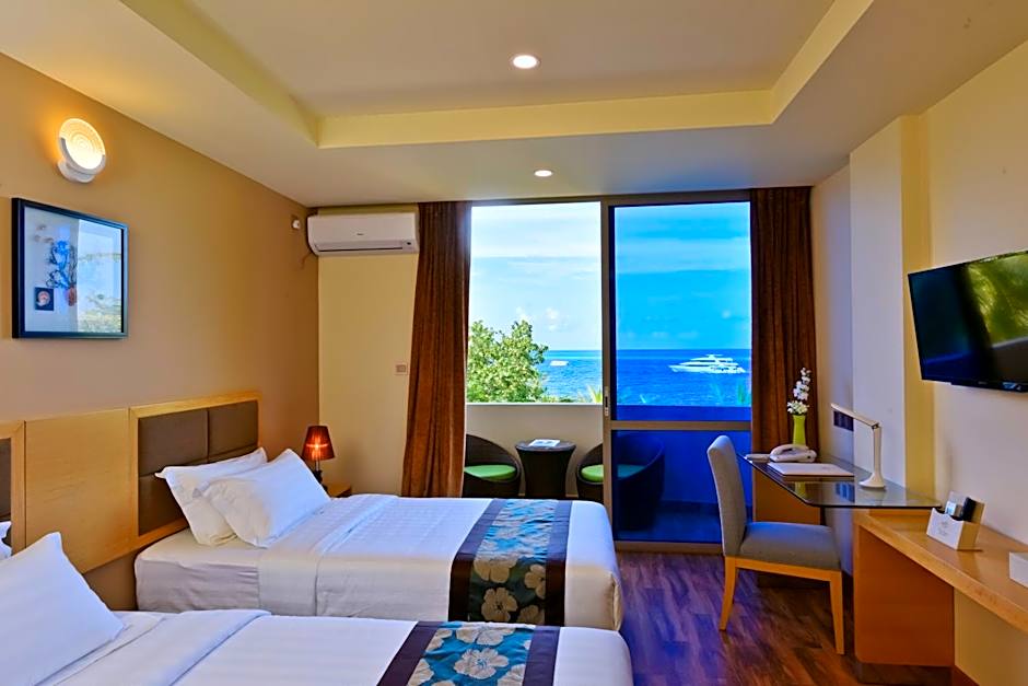 This double room has a balcony, electric kettle and soundproofing. Elegantly designed 205 square feet rooms perched on the higher floors offer a view of the local residential area and the finest of tropical foliage offered in Maldives.