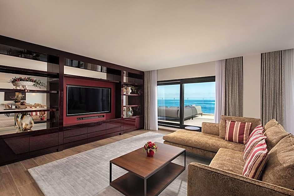 Luxury Suite, 2 Bedrooms, Non Smoking, Sea View (2 Double Beds) is 1292 square feet and includes a double bed 131-150 width plus balcony, extra beds on demand, desk, satellite tv , hairdryer, tea and coffee making facilities , ironing set, safe, bathrobes, and slippers.