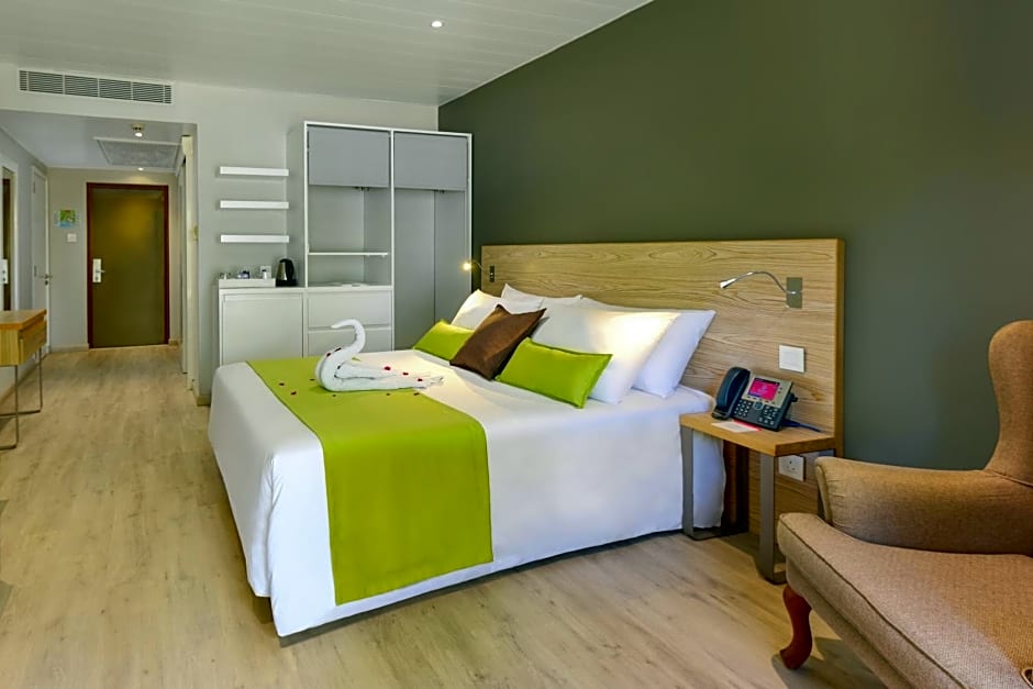 The hotel offers comfortable rooms with occupancy for up to two adults and one child, featuring either a double bed or twin beds. Each room is non-smoking and comes with a private balcony or terrace, offering views of the garden or sea. Room sizes range from 36 to 80 square meters.