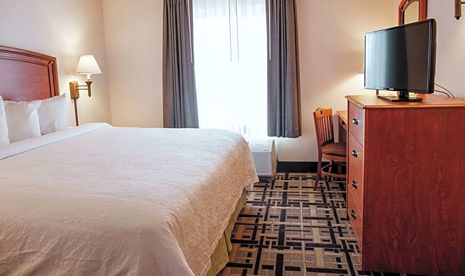 Microwave, refrigerator, 32-inch LED TV, work area, free WiFi, tea/coffeemaker, easy chair Have a relaxing stay in this king room that features our clean and fresh Hampton bed®. Unwind in the easy chair with ottoman while watching the 32-inch LED TV. Stay productive at the spacious desk and keep in touch with free WiFi. The room includes a microwave, a refrigerator and a tea/coffeemaker to help you feel at home. In the bathroom you'll enjoy fluffy towels, a WaterPik® showerhead and curved shower rod for added space and light.