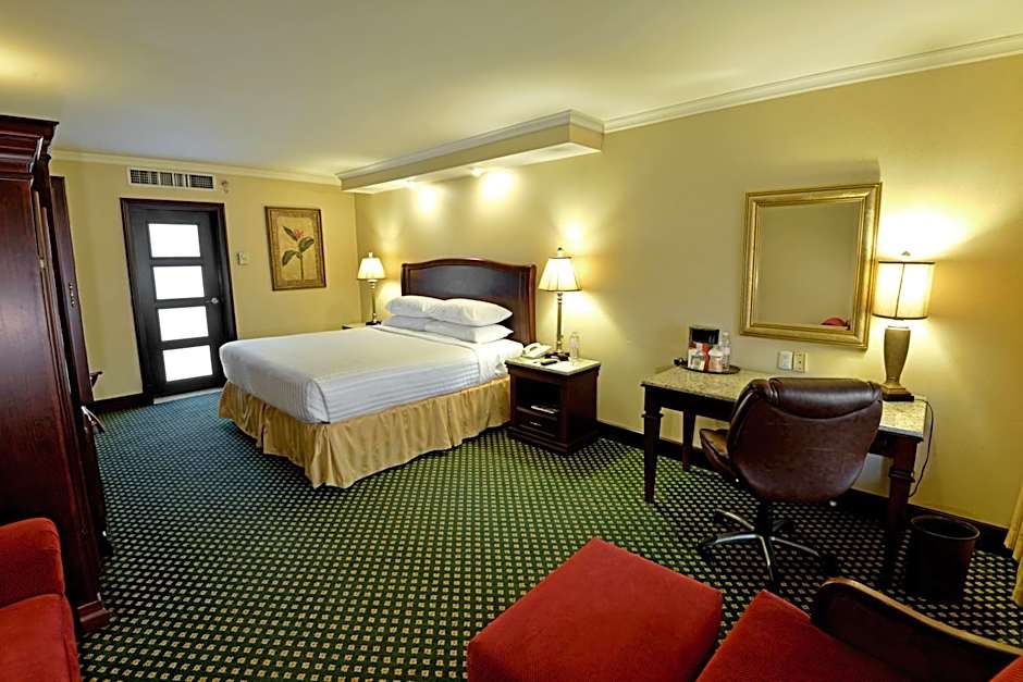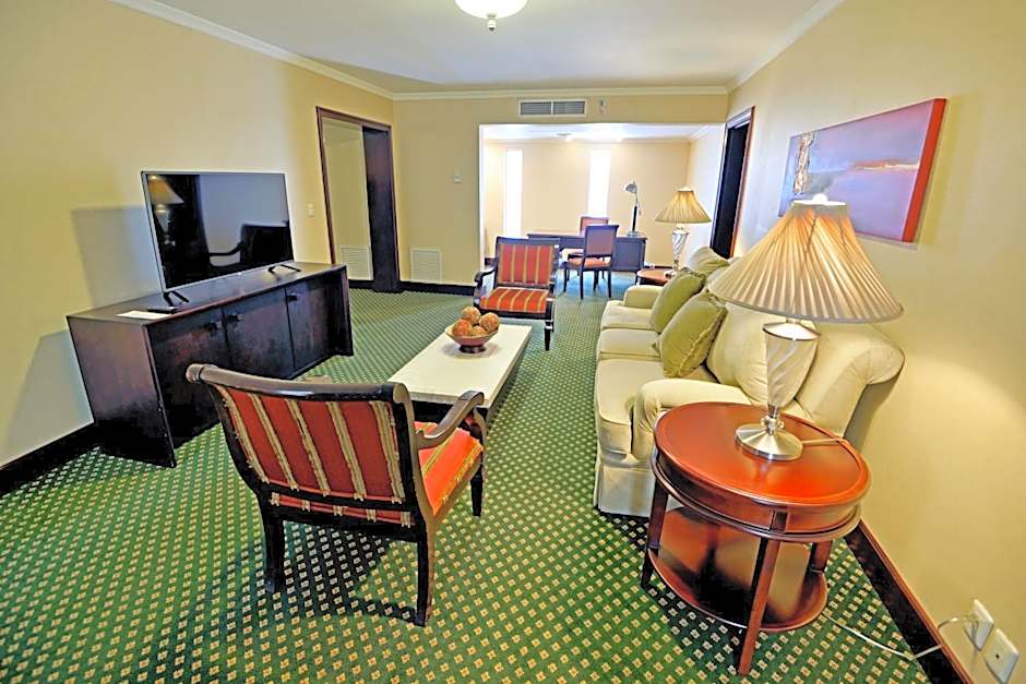 The spacious air-conditioned suite features a flat-screen TV with cable channels, a tea and coffee maker, executive lounge access and a wardrobe.