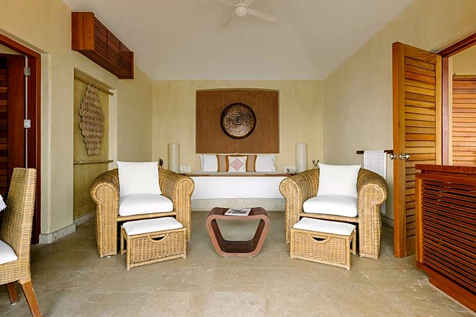 Overlooking the ocean, this impressive suite features a terrace with a Palapa-style thatched roof and an infinity plunge pool. This room features a king size bed. There is a king-size bedroom, and a seating area with satellite TV. The bathroom also offers ocean views.