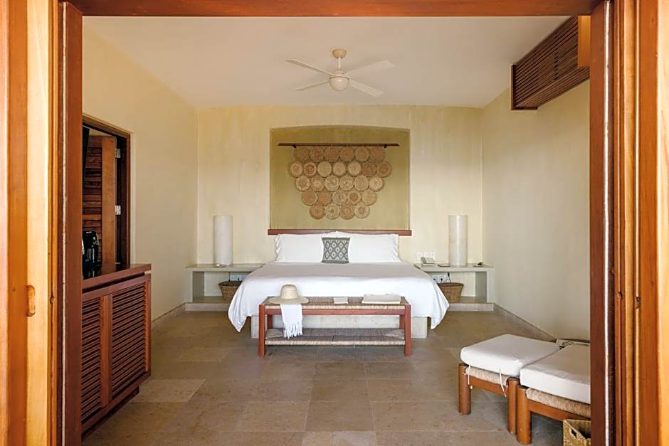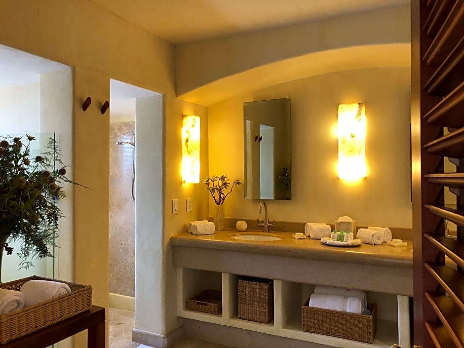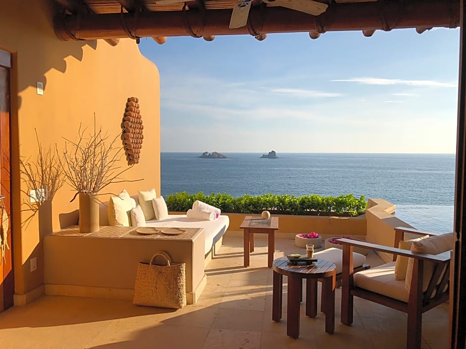 These spacious junior suites are decorated in a mixture of Mediterranean and authentic Mexican styles.This room features a king size bed.Enjoy spectacular views of the Pacific Ocean and a terrace. They have a lounge with a private plunge pool, air conditioning, satellite LCD TV, a safe and free water and soft drinks.