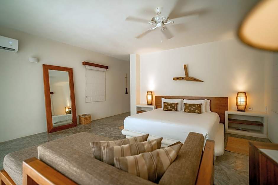A/C, black-out shades, king-size beds, a chez-lounge -serving as an additional bed-, and dim lighting. Flaxen drapery and cotton linen in natural colors contrast with colorful woven cushions with Mayan motifs. Wi-Fi, Bose Bluetooth speakers, a Nespresso coffee machine, and room service are provided as complements to a fresh and welcoming relaxing experience.