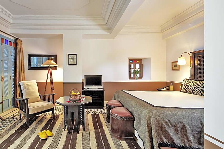 Deluxe double rooms are located on the first, second and third floors of the hotel and are accessible from the patio plant. They are decorated in a warm African or East English as bedrooms have two single beds of 35 in, a bathroom and separate toilet. They have a desk and a seating area and some large doors and a balcony overlooking the medina. The equipment is complete with wardrobe, satellite TV, safe and mini-bar.