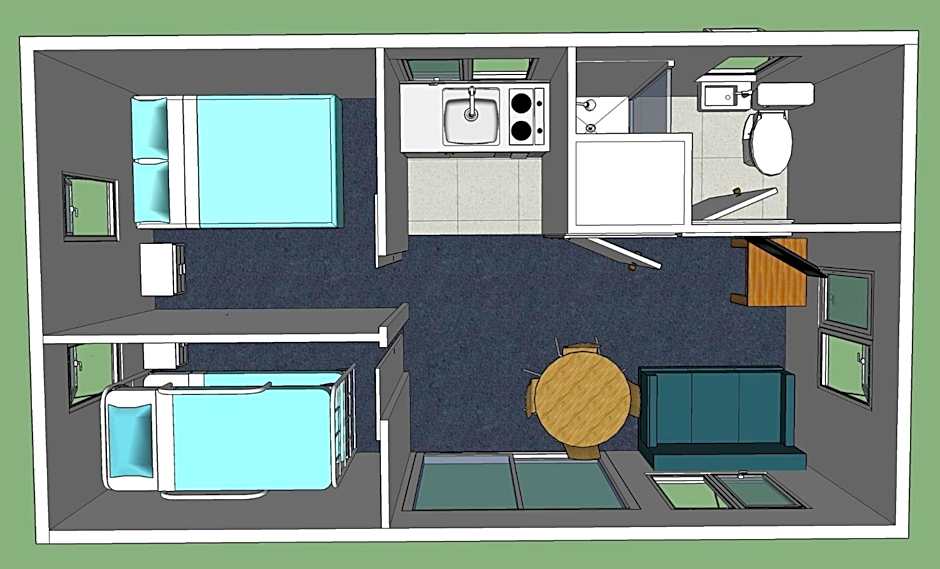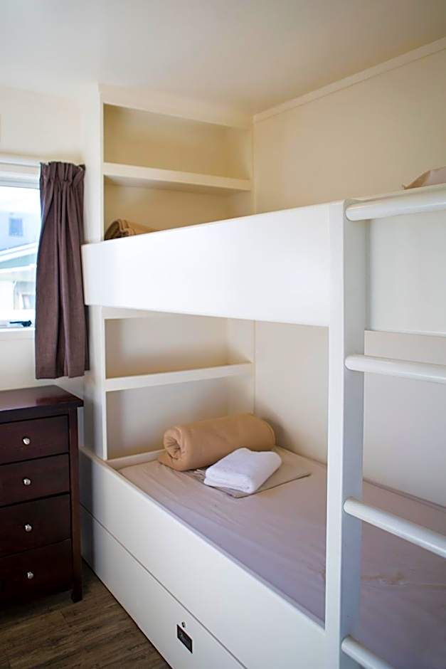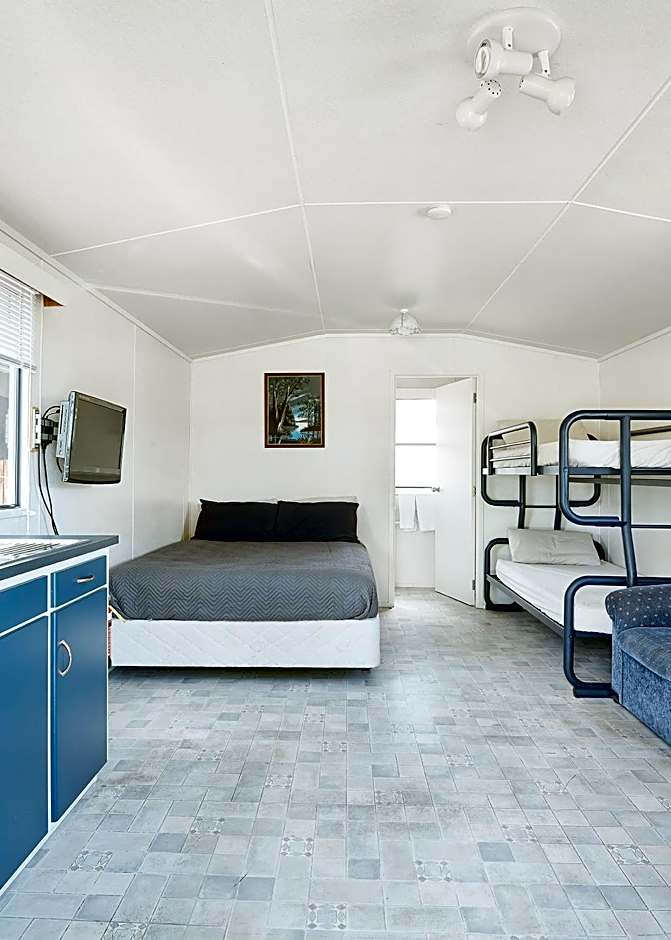 This compact cottage features a seating and dining area. Please note that the bunk beds are only suitable for children.