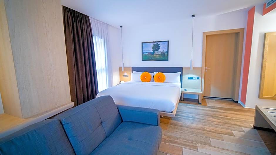 The hotel offers a Suite with a size of 452 sqft, accommodating 2 adults and 2 children, with 1 Queen size bed and 2 Sofa Beds, non-smoking. The Double Room is 226 sqft, for 2 adults and 1 child, with 1 Queen size bed, non-smoking. The Deluxe Room is 291 sqft, accommodating 2 adults and 2 children, with 1 Sofa Bed and 1 Queen size bed, non-smoking.