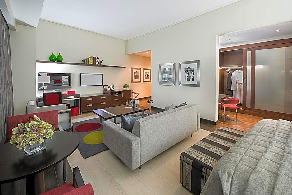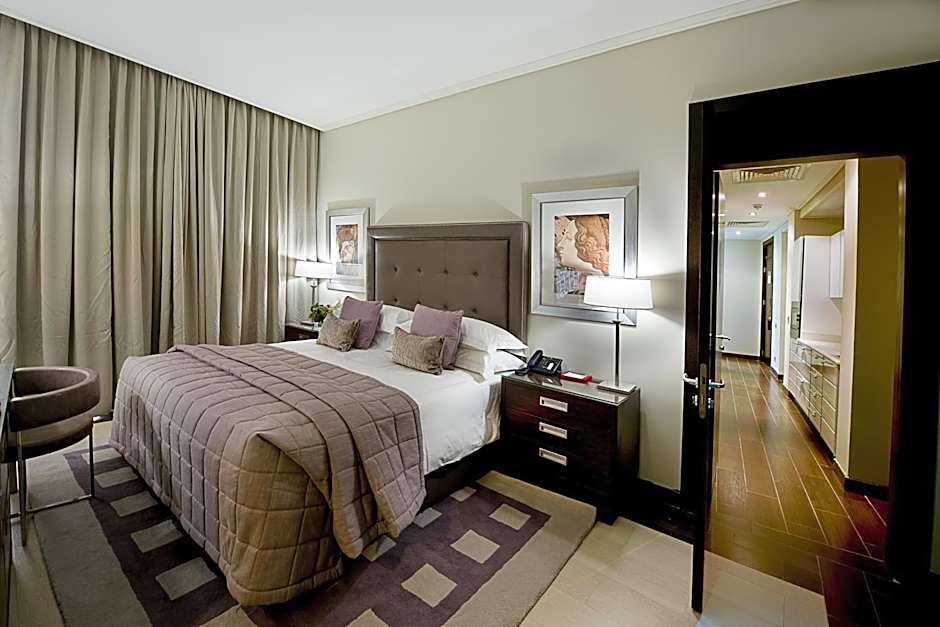 This two Bedroom penthouse suite with city view features a balcony luxury room amenities, kitchenette, air conditioning, mini-bar.