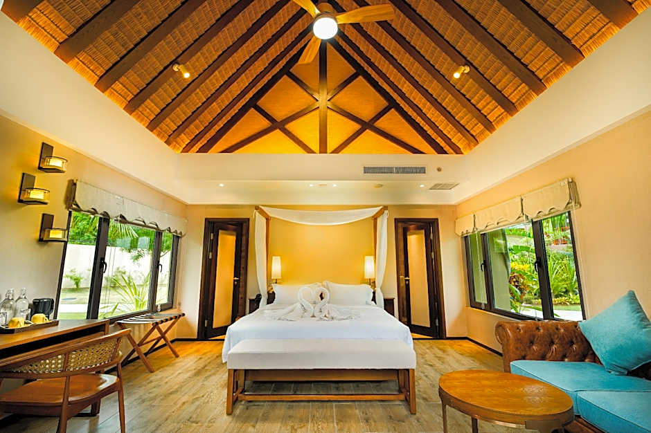 Accommodations span a range of options, including Deluxe, Queen; Deluxe, 2 Twin; Junior Suite; Suite; and various Villa layouts such as Villa, Pool View; Villa, 2 Bedroom, Pool View; and Villa, 3 Bedroom. Also available are Double Room, Patio, among other non-smoking options, many featuring a terrace or balcony, garden view, and free toiletries. Payments are accepted via Visa, American Express, and Mastercard; cash is not accepted.