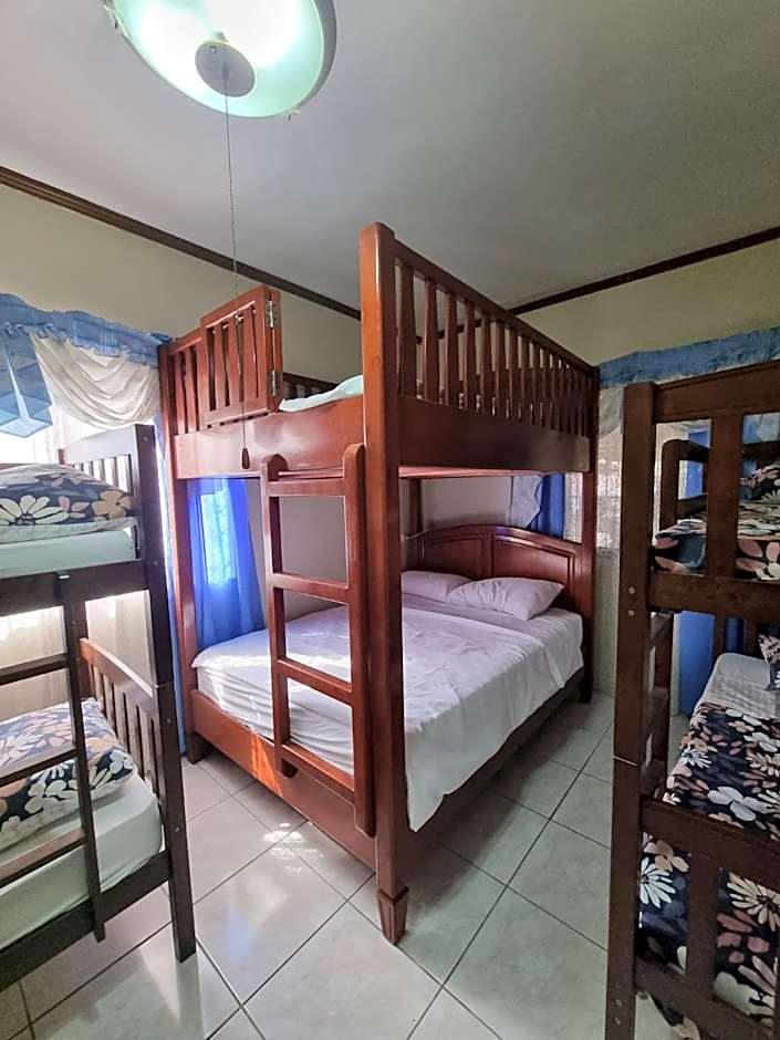 Room options cater to different group sizes. The Double Room covers 172 square feet and uses two bunk beds to sleep up to four adults. The Economy Quadruple offers a compact 129 square feet with a shared bathroom for four. The Family Room, a spacious 269 square feet option with a private bathroom, sleeps up to eight adults and two children with two double beds and three bunk beds. For larger groups, the Dormitory holds ten guests in 323 square feet with six twin beds and two double beds.