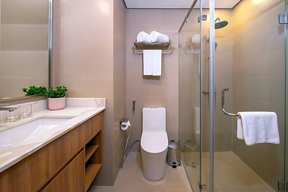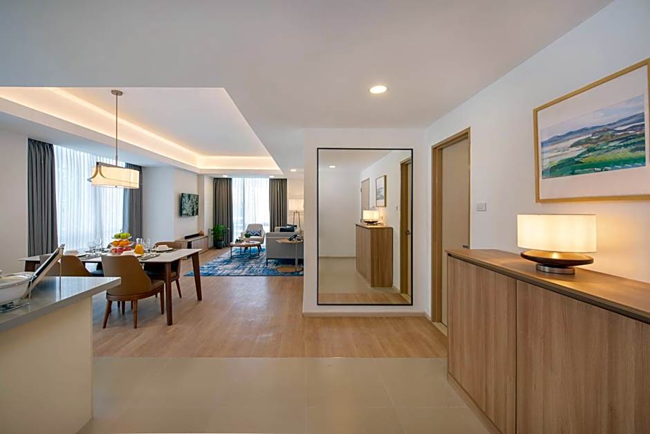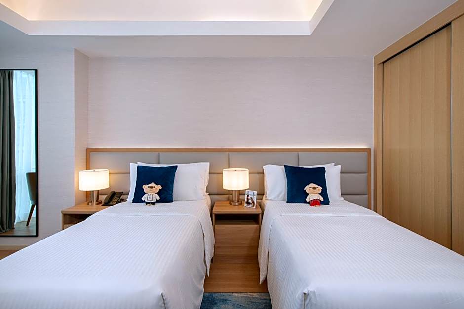 Room choices span several layouts, such as Suite, 1 Bedroom at 786 sqft; Superior Studio, 2 Twin (398 sqft); Deluxe Studio, 2 Twin (398 sqft); Deluxe, 3 Bedroom, and other configurations that accommodate 2 adults and 1 child. Payment is cashless; cash is not accepted, with accepted methods including American Express, JCB, Diners Club, Visa, Mastercard, UnionPay debit card, and UnionPay.