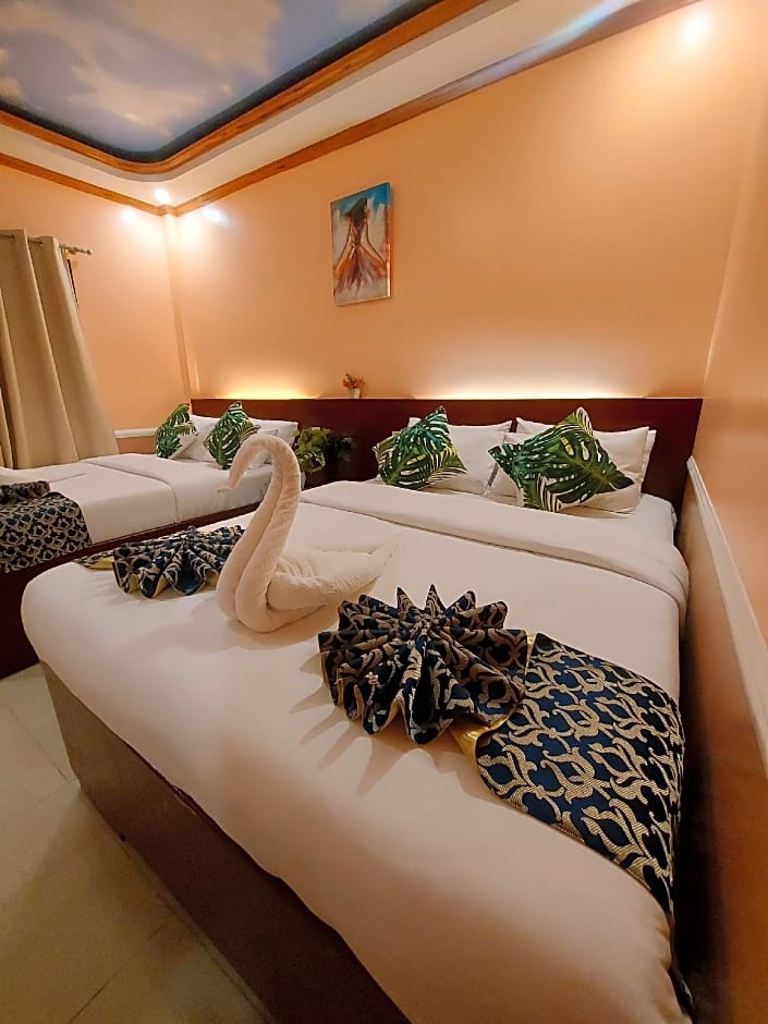 The hotel offers a variety of rooms including Standard Double rooms, Tents, Quadruple rooms with fans, Deluxe Triple rooms, Deluxe Quadruple rooms, and Family rooms with fans. All rooms are non-smoking and have different bed and room sizes. The occupancy ranges from 2 adults in the Standard Double rooms and Tents, up to 8 adults in the Family rooms with fans.