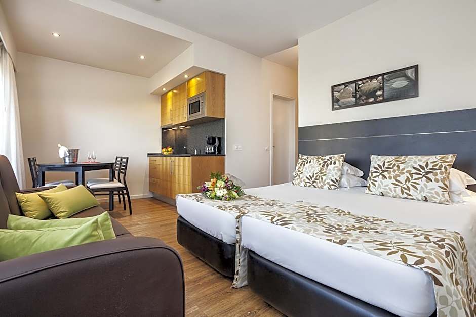 At Pestana Alvor Atlantico Residences Beach Suites, guests can choose from various studio rooms such as Superior Studio with Sea View, Studio with Sea View, and Studio with Garden View. These rooms accommodate 2 adults and 1 child, feature 2 Twin beds, and 1 Sofa Bed with no smoking allowed, and offer the same 323 sqft room size.