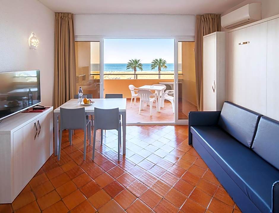The studio has a separate living area with a sofa bed, dining area and kitchenette. It is equipped with two twin beds, a private bathroom, and a balcony with a table and chairs that overlook the sea.