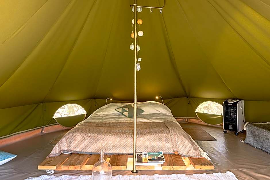 Room options include an Economy Double Room at 323 square feet with a double bed, accommodating 2 adults and 1 child, and a larger Double Room at 431 square feet, also with a double bed and the same occupancy. For something different, a Tent and a Bungalow, 1 Bedroom, are listed as accommodations, each suited for 2 adults and 1 child.