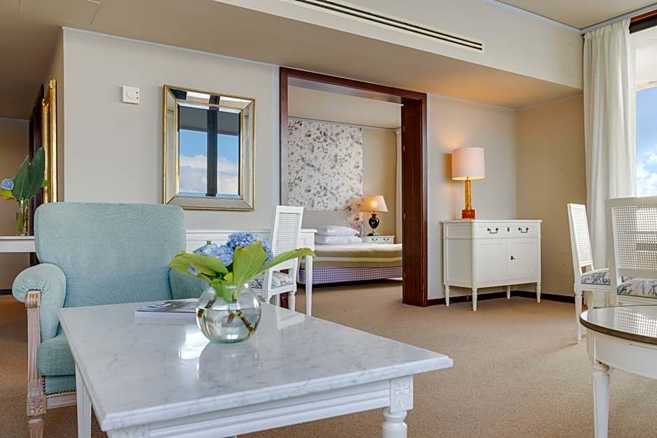 The hotel offers a variety of suites, including Senior, Triple, Quadruple, and Junior suites, with options for sea or garden views. The suites range in size from 506 sqft to 753 sqft, accommodating 2 to 4 adults with the option for children. Smoking is not allowed in any of the rooms, and bed sizes vary from twin beds to double beds, with some rooms also featuring sofa beds.