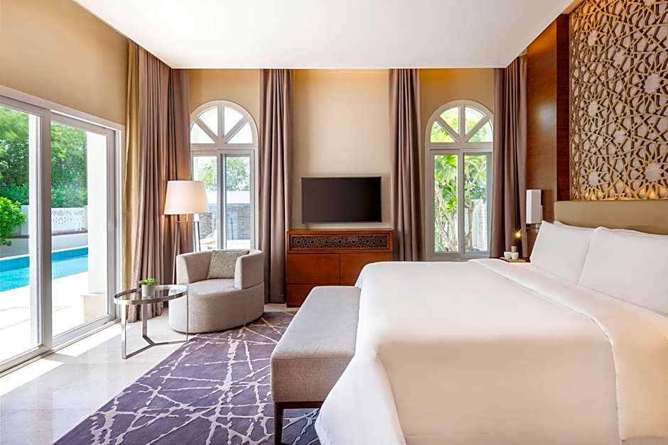 The Al Messila hotel offers a variety of room types including Deluxe Guest rooms with 2 twin beds or 1 king bed, Grand Deluxe Suites with 1 king bed, Deluxe Suites with 1 king bed, Grand Deluxe rooms with 1 king bed, Deluxe Pool View rooms with 1 king bed, and various villas with different bed configurations. All rooms are non-smoking and have an occupancy of 3 adults and 1 child or 2 adults and 2 children, except for the villas which can accommodate larger groups. Room sizes range from 484 sqft to 3703 sqft.