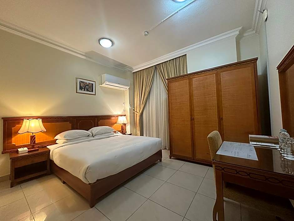 The Al Muntazah Plaza Hotel offers a variety of room types, including Deluxe Double Rooms, Junior Suites, and Deluxe Twin Rooms. All rooms are non-smoking and can accommodate 2 adults and 1 child. The Deluxe Double Room and Deluxe Twin Room have a room size of approximately 323-344 sqft, while the Junior Suite is slightly larger at 431 sqft. Bed options include 1 double bed in the Deluxe Double Room, 2 twin beds in the Deluxe Twin Room, and 1 queen size bed in the Junior Suite.